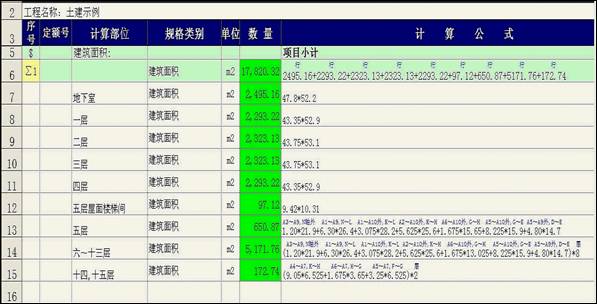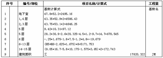 本表采用規范的數據錄入,按先數字軸后字母軸和大扣小的原則,可以不列軸號、不在圖紙上做標志即可使所有人列式順序統一;第7行中的H5和H6體現了調用功能,分別表示第5、6行的計算結果,可使計算式不致過長;第9行體現了匯總功能;基數名JM是建筑面積的變量,可在工程中調用。