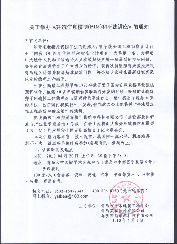 關(guān)于舉辦《建筑信息模型(BIM)和平法講座》的通知