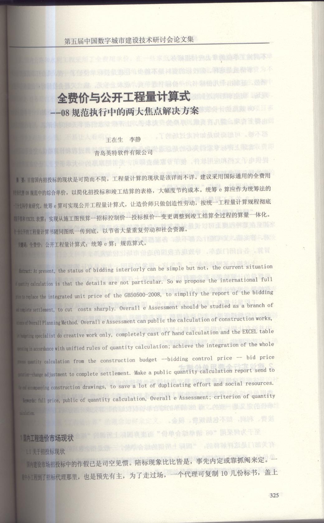 近期,青島英特軟件有限公司董事長、高級工程師王在生先生和總經理李靜女士的兩篇論文《工程量計算的定義與四化》、《全費價與公開工程量計算式》相繼在住房和城鄉建設部核心期刊“《中國建設信息》雜志第469期(11月下旬期刊)”、“《數字城市理論與實踐》(第五屆中國數字城市建設技術研討會論文集)”上發表。這些論文的發表標示著王在生董事長的理念得到了更多人的支持,同時,也說明王在生董事長理念的價值。