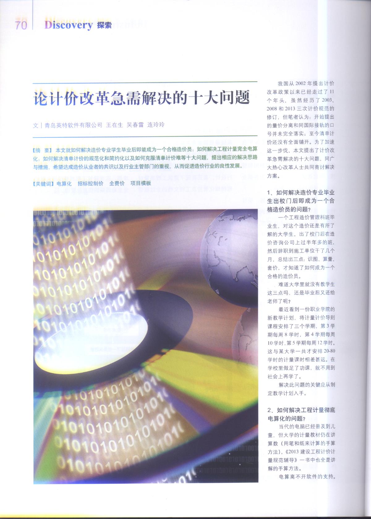 近期,青島英特軟件有限公司董事長王在生、副總經理吳春雷,連玲玲的論文《論計價改革急需解決的十大問題》于《中國建設信息》2014年1月總第545期中發表。