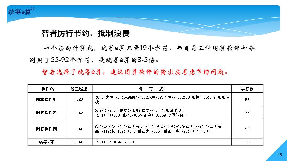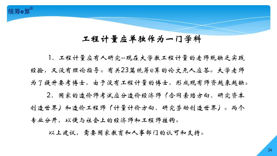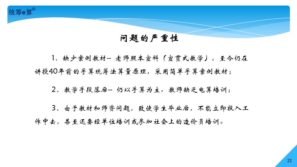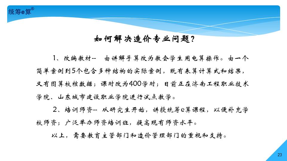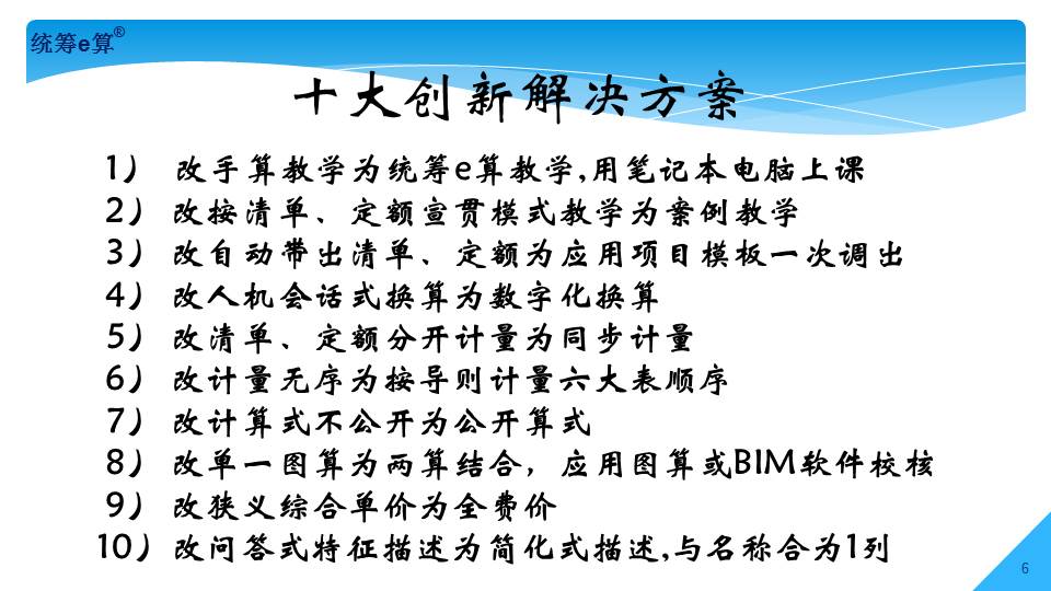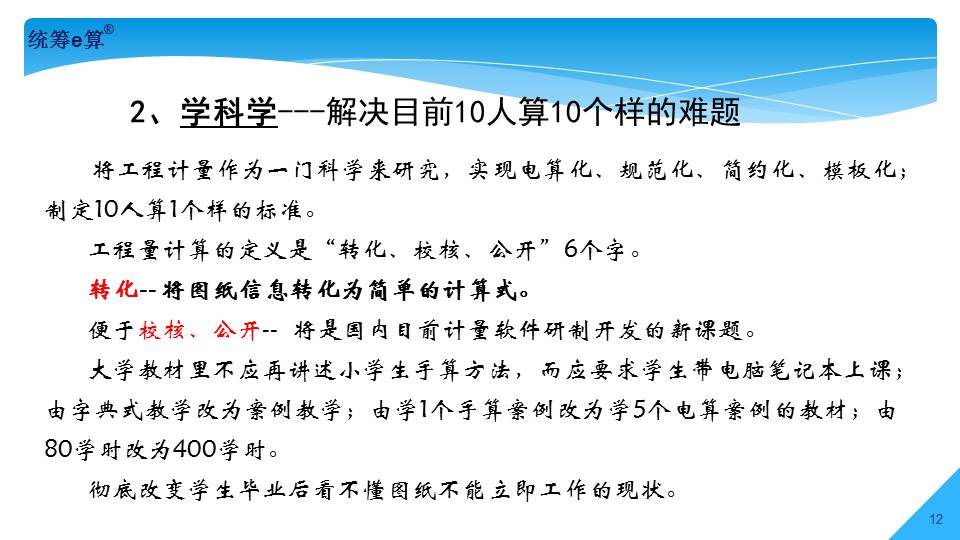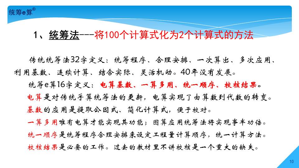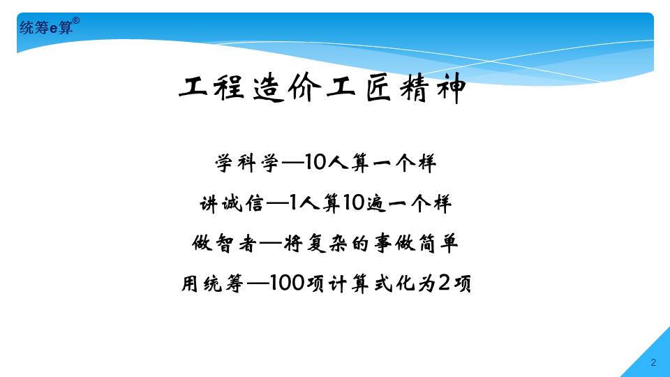 “上世紀(jì)70年代,國(guó)內(nèi)造價(jià)界發(fā)生了兩件大事,一是推廣統(tǒng)籌法計(jì)算工程量;二是應(yīng)用電子計(jì)算機(jī)算量。兩者結(jié)合在一起經(jīng)過(guò)了30多年的發(fā)展,現(xiàn)稱(chēng)為‘統(tǒng)籌e算’,將是國(guó)內(nèi)算量的發(fā)展趨勢(shì)。”