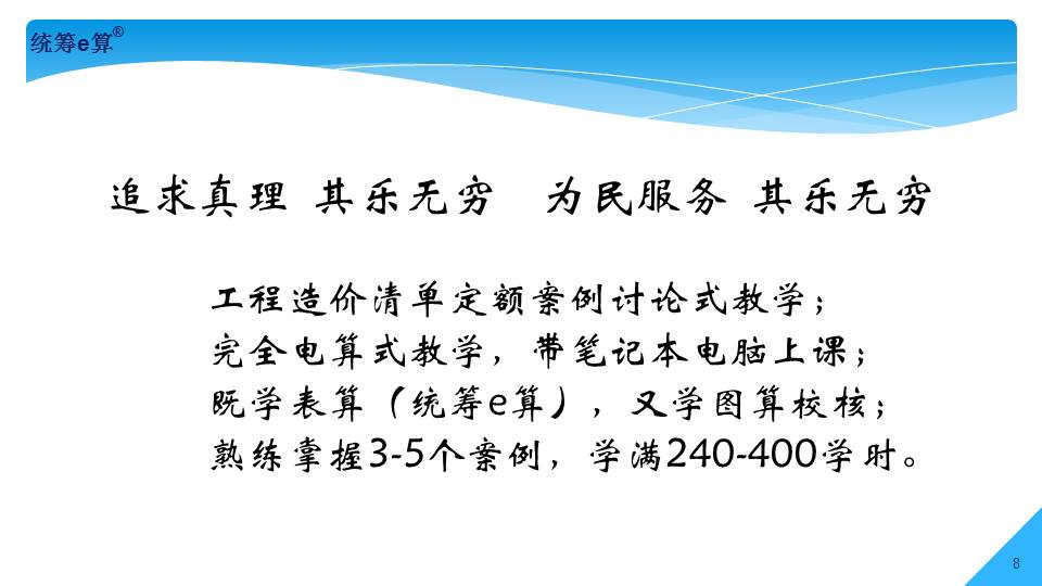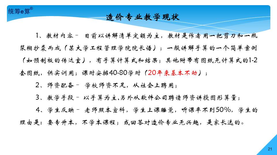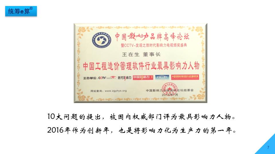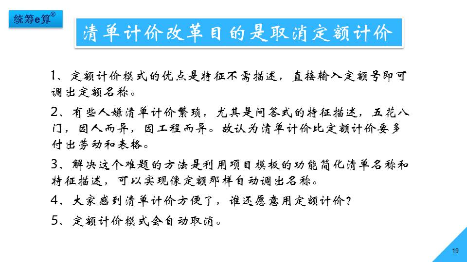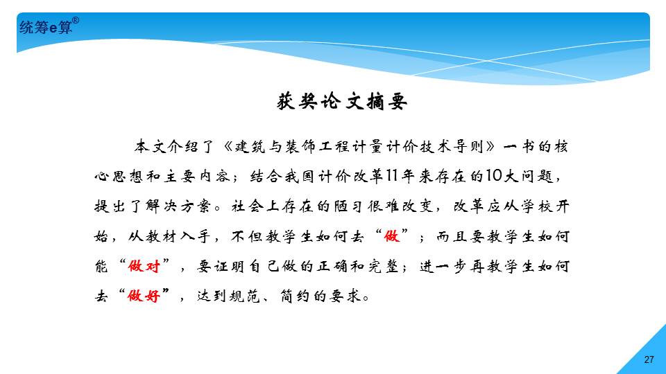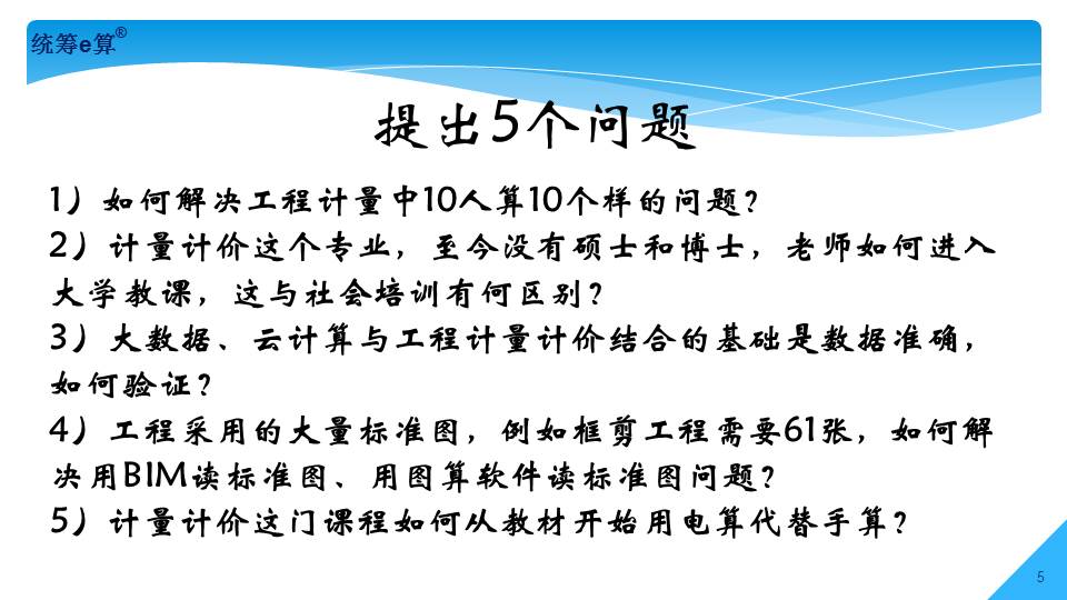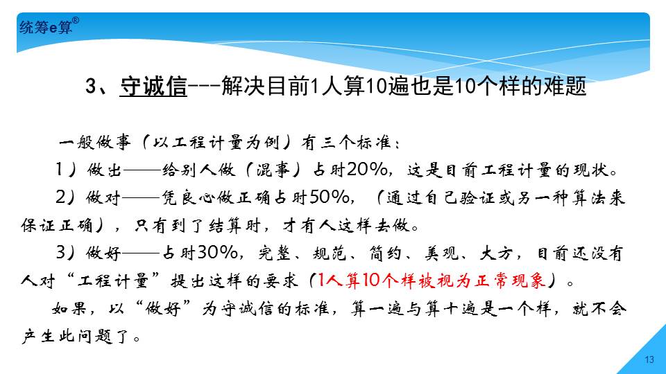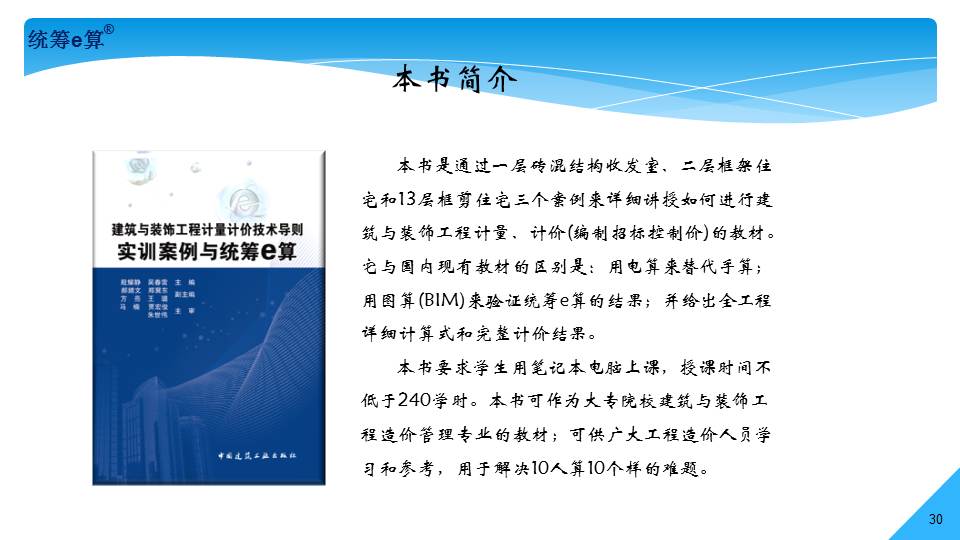“上世紀(jì)70年代,國(guó)內(nèi)造價(jià)界發(fā)生了兩件大事,一是推廣統(tǒng)籌法計(jì)算工程量;二是應(yīng)用電子計(jì)算機(jī)算量。兩者結(jié)合在一起經(jīng)過(guò)了30多年的發(fā)展,現(xiàn)稱(chēng)為‘統(tǒng)籌e算’,將是國(guó)內(nèi)算量的發(fā)展趨勢(shì)。”